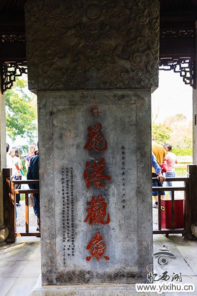 如今去花港观鱼,可见石碑上的“鱼”字,下面的一横是三点,是简化之前的繁体字。不过,繁体字“魚”下面应该是四点,但碑上仅有三点,也是出自乾隆之手的错别字,关于这个字也有两种说法: